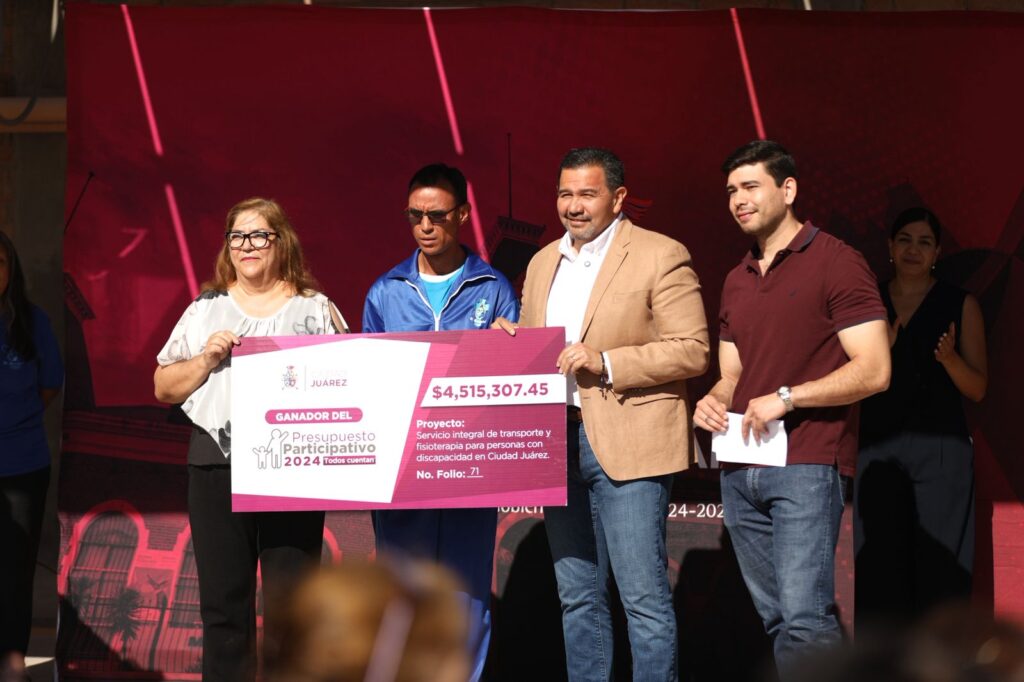 Ciudad Juárez.— El Presidente Municipal, Cruz Pérez Cuéllar, encabezó la entrega de un apoyo social derivado del Presupuesto Participativo, en beneficio de la organización Manantial Hogar, destinada al servicio integral de transporte y fisioterapia para personas con discapacidad.