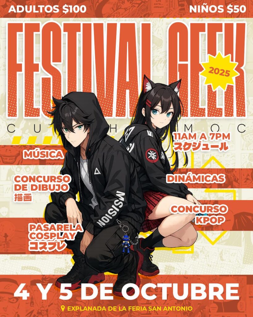 Cuauhtémoc, Chih. – Este 4 y 5 de octubre, la Explanada de la Feria de San Antonio será sede de la 4ta edición del Festival Geek, un evento que reúne a fanáticos de la cultura pop, videojuegos, música y cosplay en un solo lugar.