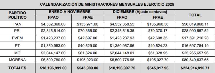 El Instituto Estatal Electoral (IEE) aprobó el proyecto para la redistribución de financiamiento público a los partidos políticos en el Ejercicio Fiscal 2025. Morena recibirá 80 millones de pesos, mientras que el PAN obtendrá 56 millones. En total, se destinarán 224 millones de pesos al PAN, PRI, Partido Verde, Partido del Trabajo, Movimiento Ciudadano y Morena.